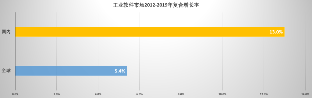 根據(jù)中國工業(yè)技術(shù)軟件化產(chǎn)業(yè)聯(lián)盟發(fā)布的《中國工業(yè)軟件產(chǎn)業(yè)白皮書(2020)》顯示,2012-2019年,全球工業(yè)軟件市場規(guī)模復(fù)合增長率為5.4%,國內(nèi)工業(yè)軟件產(chǎn)業(yè)規(guī)模雖然僅占全球工業(yè)軟件市場規(guī)模的6%,但增速較快,2012-2019 復(fù)合增長率為13%,是全球市場的兩倍有余。