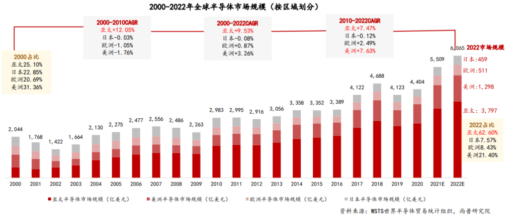 根據(jù)VSTS世界半導(dǎo)體貿(mào)易統(tǒng)計(jì)組織的預(yù)測數(shù)據(jù),2022年亞太地區(qū)(除日本)半導(dǎo)體產(chǎn)業(yè)市場規(guī)模將達(dá)到3797億美元,占全球市場的62.6%。