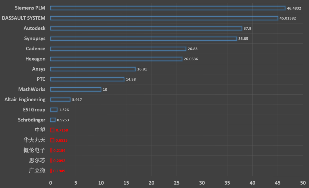 為了看看這到底是什么水平,我們一一查閱了EDA/CAE/BIO等行業(yè)主要龍頭應(yīng)用廠商的財(cái)報(bào),統(tǒng)計(jì)了他們2020年在應(yīng)用產(chǎn)品和服務(wù)上的收入。