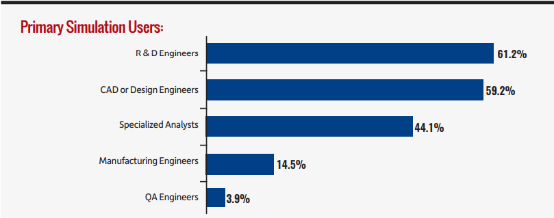 報告顯示,涉及生產制造的部門均需要不同程度地使用仿真,包括研發工程師、CAD/設計工程師、高級分析師、質保工程師、制造工程師等。近一半的受訪者表示公司已在工程內部部署仿真并將其作為產品開發的一部分,仿真主要服務的用戶為研發工程師(61.2%)、其次為CAD/設計工程師(59.2%)。