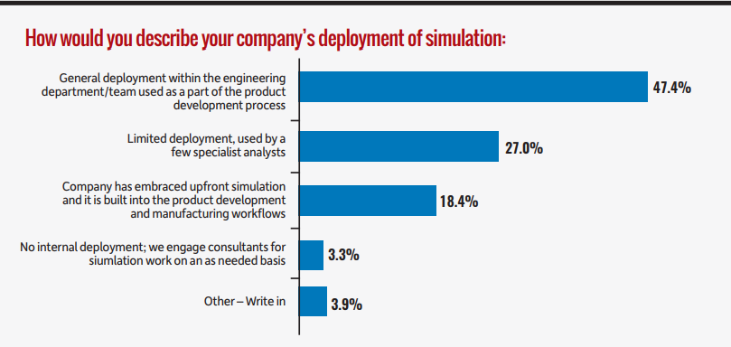 報告指出,僅有3.3%的公司想依靠外包解決仿真問題;47.4%的公司已將仿真作為工程部門的常規事業部,認為這是產品開發不可或缺的一部分;18.4%的公司一直推進前期仿真并致力于將其固定成產品制造過程中的一環。