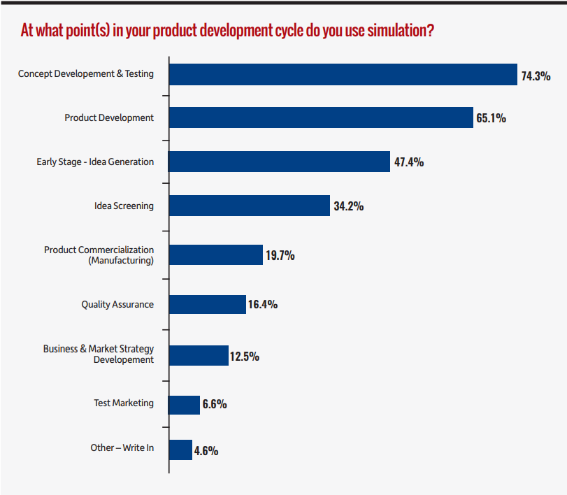 報告顯示,在概念開發和測試階段使用仿真占比為74.3%,在產品開發階段使用仿真的占比為65.1%。
