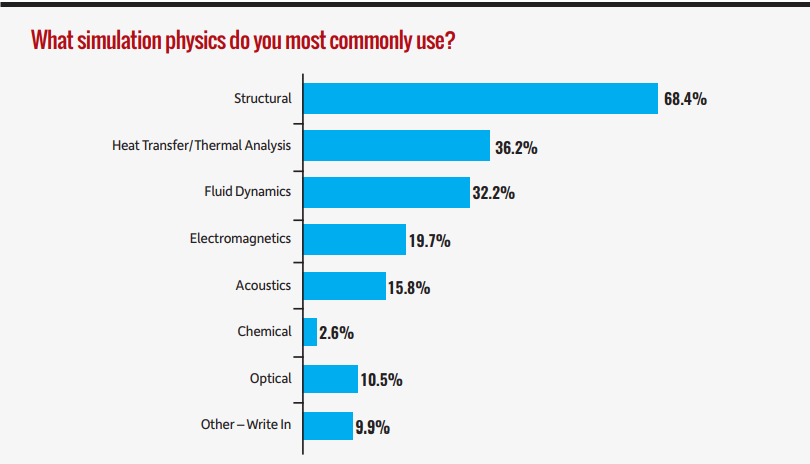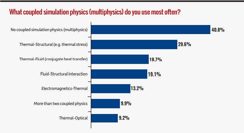 報告顯示,?約60%的受訪者使?多物理場仿真耦合,9.9%的受訪者使?兩種以上的多物理場耦合,約有29.6%的受訪者使用熱-結構多物理場耦合,其次是熱流體/共軛傳熱,約有19.7%的受訪者使用。