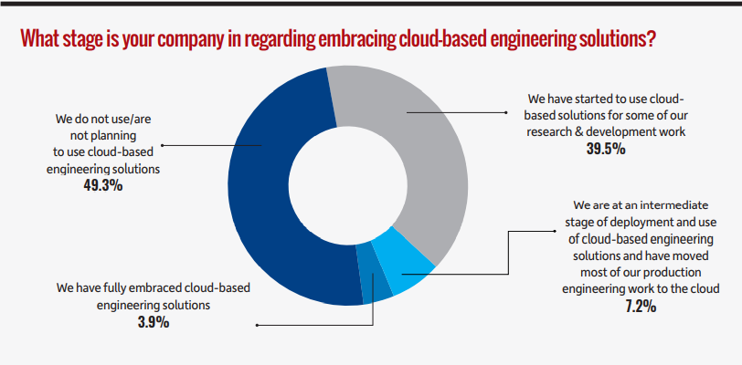 數據顯示,11.1%的公司已經將大部分工程相關工作搬到了云上,3.9%的公司更是采用了全云的工程解決方案,39.5%的公司已將部分研發工作部署在云端。