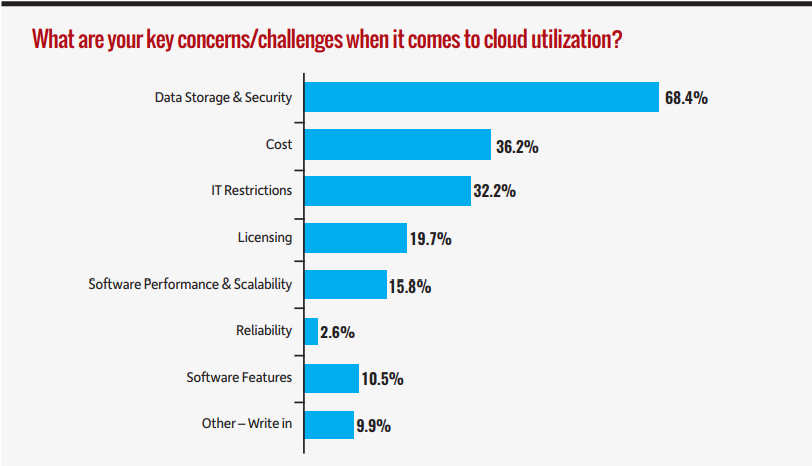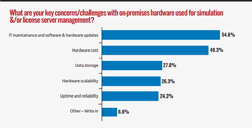 當被問到跑仿真應用最大的顧慮是什么,54.6%的受訪者選擇了軟件更新/IT維護,49.3%的受訪者選擇了硬件成本,27%的受訪者選擇了數據存儲,26.3%的受訪者選擇了硬件可擴展性。