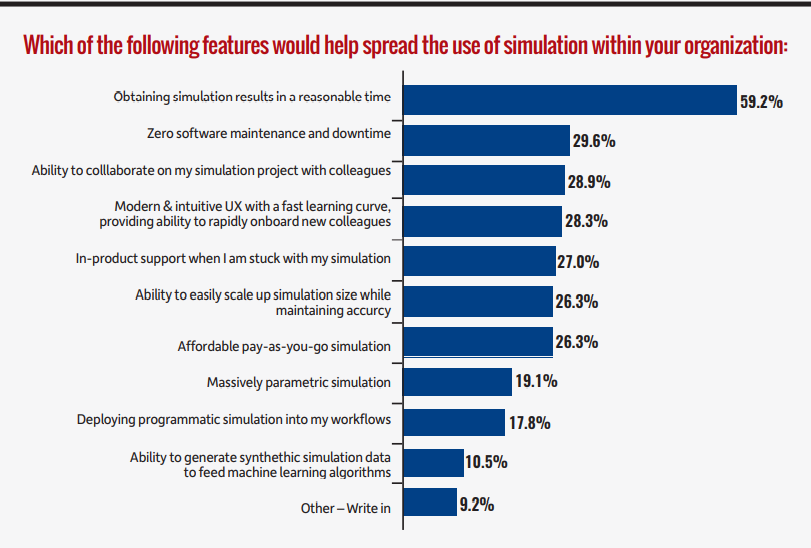 當問到他們哪些因素會有助于仿真的內部推廣時,59.2%的受訪者希望看到獲得仿真結果的速度能夠提高,29.6%的受訪者選擇了希望零軟件維護/停機時間,28.9%的受訪者認為是仿真協同。