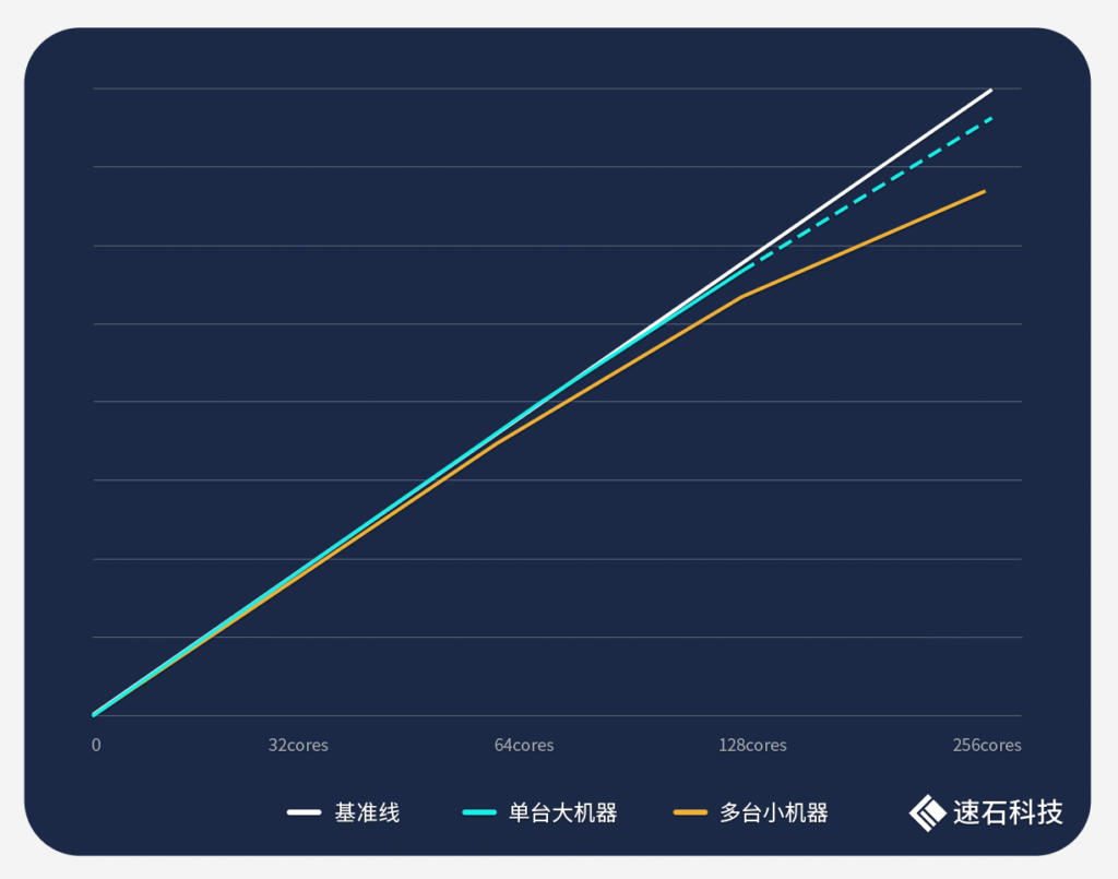 單臺大機器場景下,隨著核數的增加,任務耗時呈現明顯的線性下降關系,整體性能曲線非常貼近基準線(單機核數有上限,本次實證中,我們使用的最大單機為128核,并根據32核、64核、128核的耗時規律預估了256核單機的耗時數據,僅供參考)。