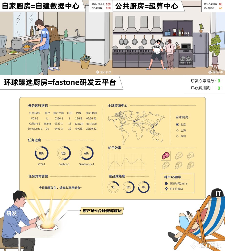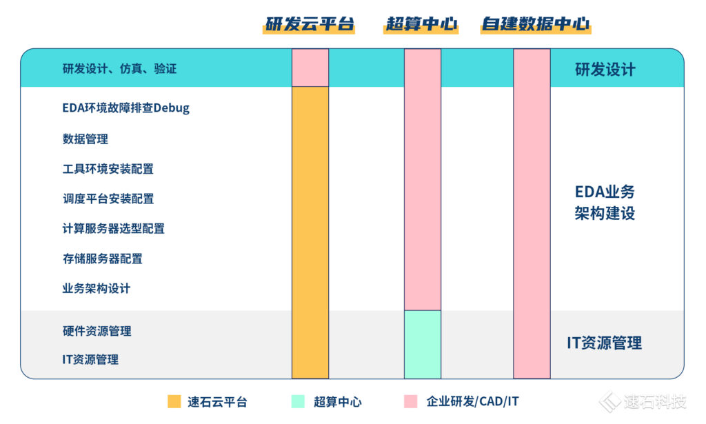 研發與IT的分工界面,在自建數據中心、超算、速石研發云平臺這三者之間完全不同。