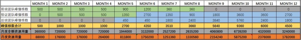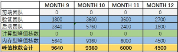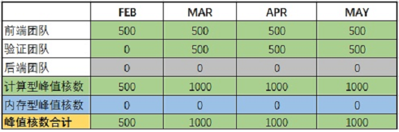 2-4月:前端團(tuán)隊峰值核數(shù)=10*50*1=500 ;