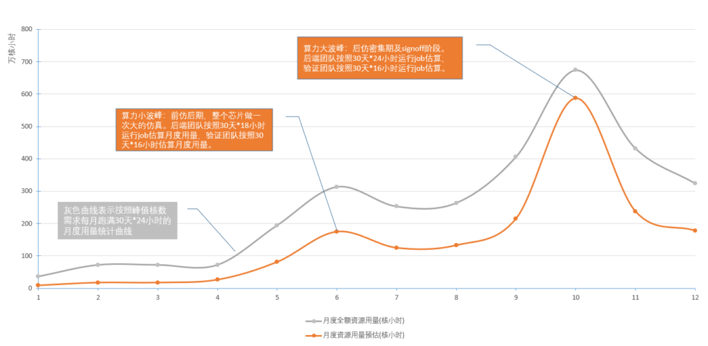 這套算法是我們根據(jù)有項目經(jīng)驗的芯片研發(fā)團(tuán)隊的實際情況,通過填入各月每job峰值核數(shù)、每月最大并行job數(shù),計算出各團(tuán)隊每月所需的算力峰值。