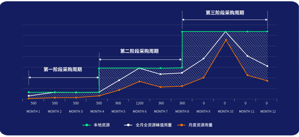 綠色代表本地資源,必須按這一階段需求峰值準(zhǔn)備,也就是按灰色來準(zhǔn)備。買不到峰值,肯定會影響到芯片項目進(jìn)度。