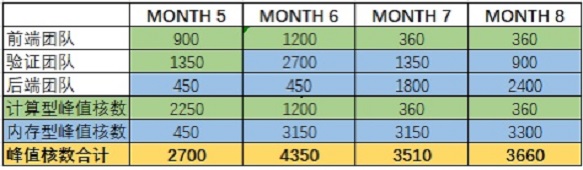 2. ?從5月開始,前端、驗證、后端均開始工作,算力開始逐步提升,第11個月達(dá)算力小高峰,在第16個月達(dá)算力最高峰,月度調(diào)度峰值達(dá)到百萬級核時以上;