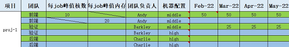 例如:2022年2-5月,前端團(tuán)隊的每job峰值核數(shù)為10,job數(shù)為50;2月驗證團(tuán)隊還未開始任務(wù),3-5月,驗證團(tuán)隊的每job峰值核數(shù)為20,job數(shù)為25;2-5月,后端團(tuán)隊還未開始任務(wù)。