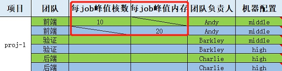 例如:每個job需要的峰值核數(shù)為10,每個job需要峰值內(nèi)存為20(據(jù)經(jīng)驗值統(tǒng)計),前端負(fù)責(zé)人為Andy。