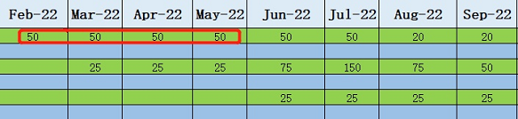 例如:2022年2-5月,前端團(tuán)隊每人最大并行job數(shù)為1,團(tuán)隊有50人,均100%投入在此項目中,則填入下表的job數(shù)均為:50*1*100%=50。