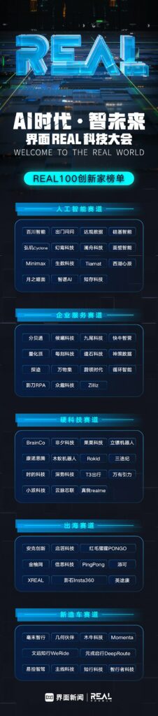 本次“REAL 100創(chuàng)新家”榜單覆蓋人工智能、企業(yè)服務(wù)、硬科技、出海、新造車(chē)五大熱門(mén)賽道,由界面新聞聯(lián)合70余家頂級(jí)投資機(jī)構(gòu),聚焦科技與創(chuàng)投領(lǐng)域的新機(jī)遇、新趨勢(shì)和新模式,耗時(shí)超過(guò)六個(gè)月的時(shí)間,從數(shù)百家入圍名單中,遴選出最能代表前沿產(chǎn)業(yè)趨勢(shì)的創(chuàng)新企業(yè),展示行業(yè)中多元化的創(chuàng)新力量。