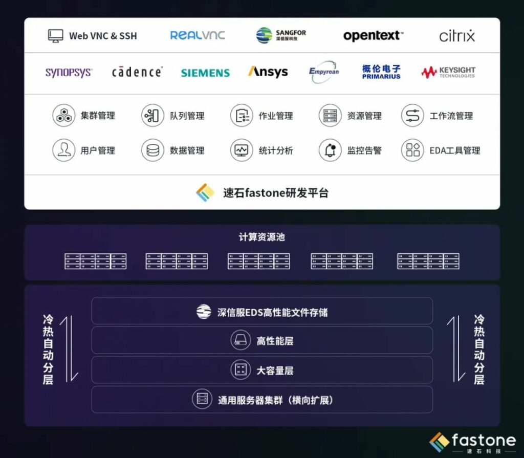 本方案基于速石科技旗下產(chǎn)品——FCP(fastone Compute Platform),結合深信服EDS分布式存儲,為半導體行業(yè)提供具備高性能存儲的一站式芯片研發(fā)平臺,以減輕企業(yè)搭建和管理復雜研發(fā)環(huán)境的壓力,幫助其降本增效,構筑數(shù)據(jù)保護閉環(huán),保障業(yè)務連續(xù)穩(wěn)定運行。